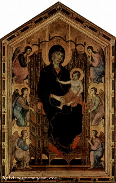 Il 15 aprile 1285 gli venne commissionata la cosiddetta Madonna Rucellai, dalla Compagnia dei Laudesi per la chiesa di Santa Maria Novella a Firenze, ora agli Uffizi. Venne detta "Rucellai" perché venne collocata nella cappella della famiglia Rucellai. In questa opera è raffigurata la Madonna col Bambino in maestà, fiancheggiati da sei angeli. L'opera si ispira alla Maestà del Louvre di Cimabue, dipinta circa 5 anni prima, tanto che a lungo venne creduta un'opera di Cimabue e tale errata attribuzione fu sostenuta a lungo, anche dopo il ritrovamento del documento di allogazione (1790). Questa "maestà" è un'opera chiave nel percorso dell'artista, dove la solida maestosità e l'umana rappresentazione di Cimabue viene incrociata con una maggiore aristocraticità, con un contenuto umano ancora più dolce. Inoltre vi immise un nervoso ritmo lineare, come sottolineato dal capriccioso orlo dorato della veste di Maria che disegna una complessa linea dal petto fino ai piedi. Fonte: Wikipedia