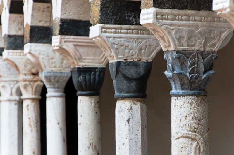 L'originaria parte romanica è articolata su undici arcate per ogni lato, sostenute da esili colonnette che sostengono capitelli riccamente scolpiti con motivi vegetali, al di sopra dei quali ci sono pulvini a gruccia ornati da motivi geometrici e nastri intrecciati; il tutto all'insegna di un'elegante tricromia, realizzata con materiali lapidei bianchi, rosati e neri.